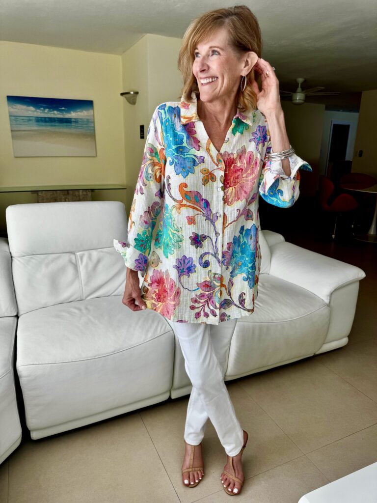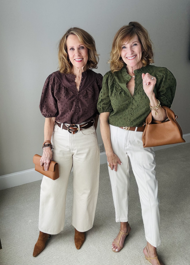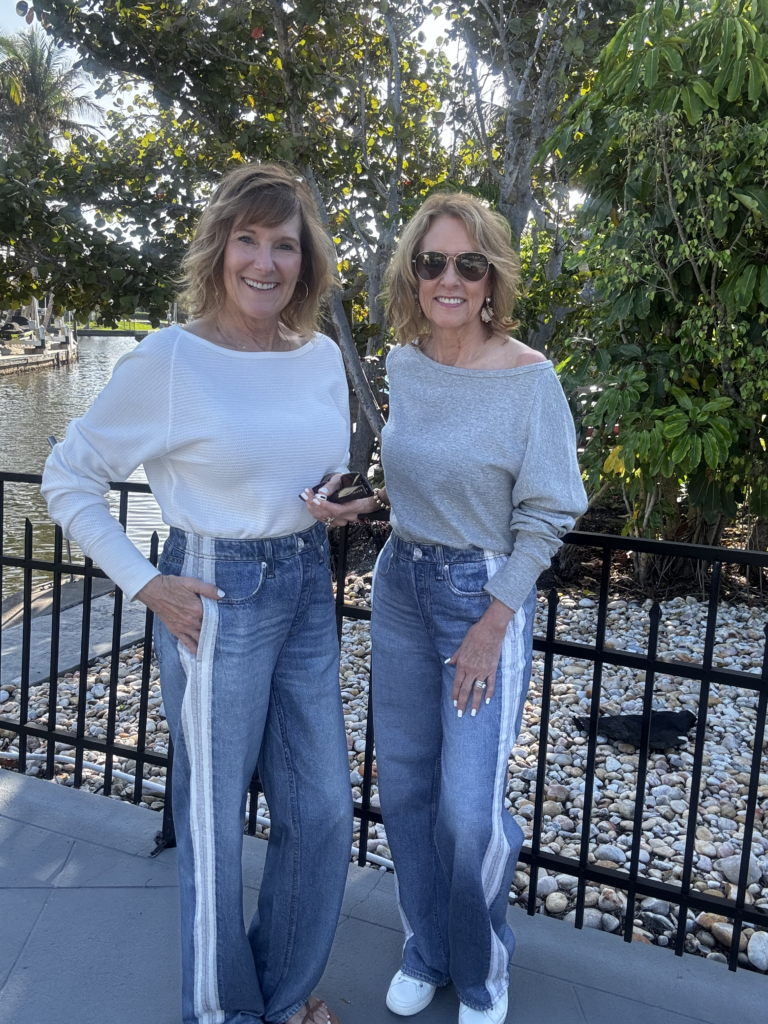 We both have completely different figures which makes shopping together so fun. Some of the denim Bev looks great in is not flattering on Val. Here are our differences…Bev is 5’6 and Val is 5’5…doesn’t seem like much of a difference but it is. Bev’s legs are really long and Val’s not so much. Val’s waist is smaller and she has a more curvier frame where Bev has a more rectangular shape with more waist. We hope this helps when you are looking through our choices in determining what denim would be the best for you!