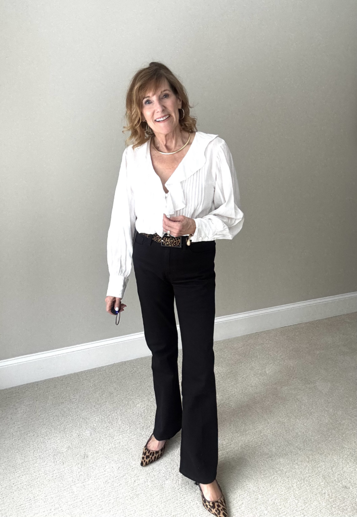 This Banana Republic Wide Leg Jean looks great on Bev. She ordered them in a 34 Long to accommodate the length of her legs. A similar jean would be the Paige Anessa Jean. This jean is also available in a 31 or 33 inch inseam if you have long legs! The Anessa Jean fits most body types and they are super flattering!