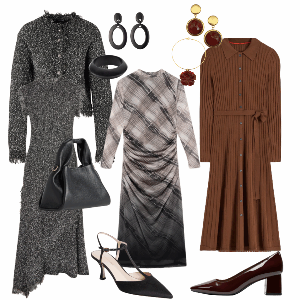 We love finding dresses to share because they are the easiest to style- one and done. Check the Karen Millen Tweed Yarn Fringe Dress and matching knit Cardi, the Mint Velvet Brown Checked Mesh Midi Dress and the Boden Rachel Knitted Shirtdress. The Quince Trapeze Italian Leather purse is a new favorite of Bev’s. She has one in the camel color and it is the perfect size as a crossbody. We included the Easy Spirit Dorian Block heel– love it and the Tuckernuck Margot t-strap heel– classic.