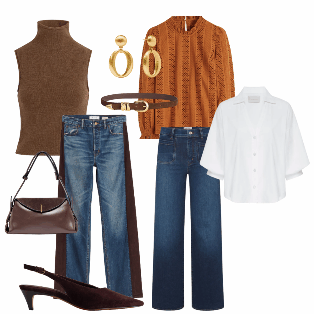 Elevate your look with these brown corduroy flares from Mint Velvet and the Madewell Ruffled Pintuck Top. A denim midi skirt is another outfit idea that looks pulled together with very little effort. The cozy sweater from Mint Velvet has a detachable scarf detail that is unique. Click on any photo below for more information and details.