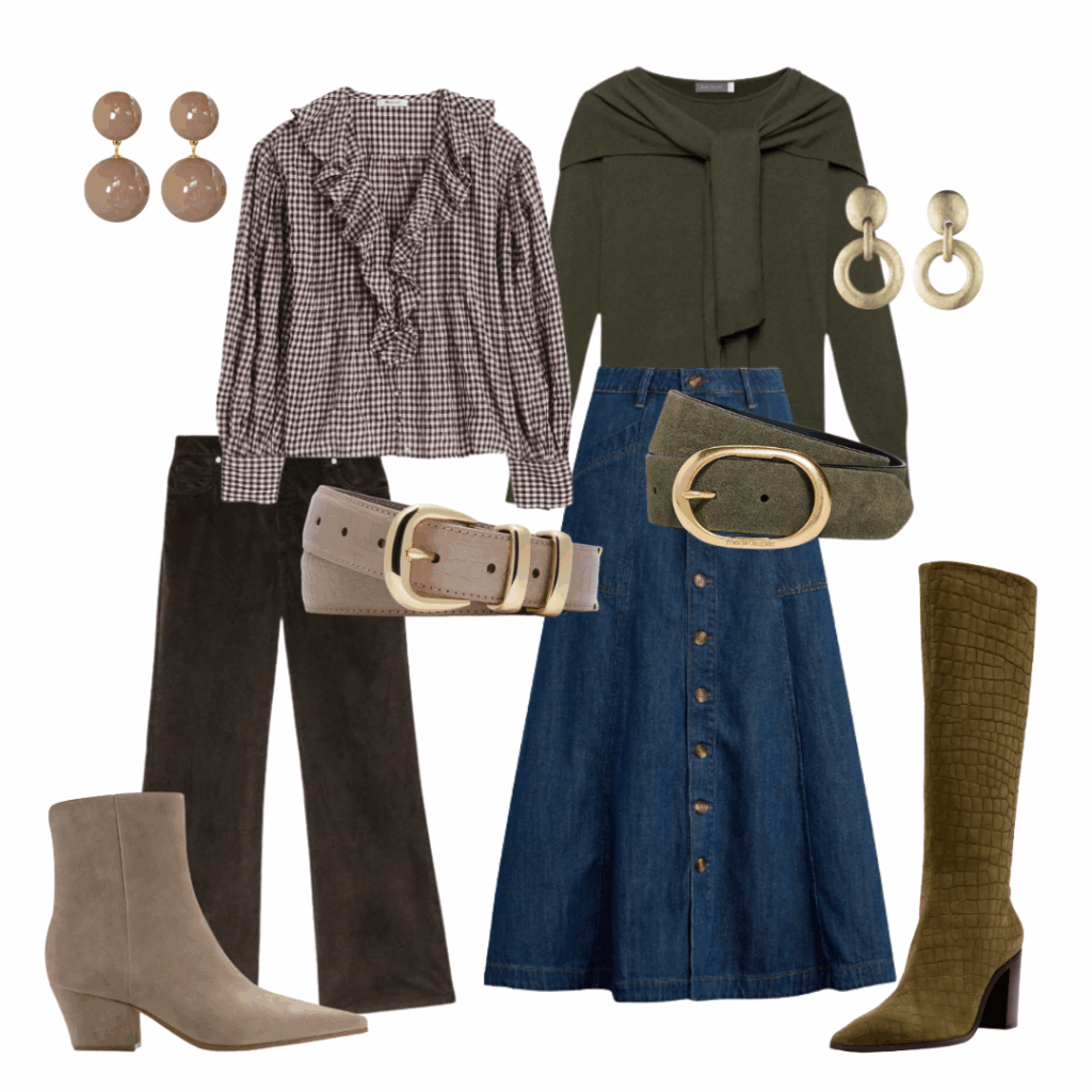 Earrings | Blouse | Sweater | Earrings | Corduroy | Belt | Skirt | Belt | Bootie | Boots